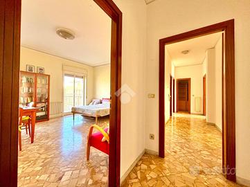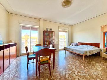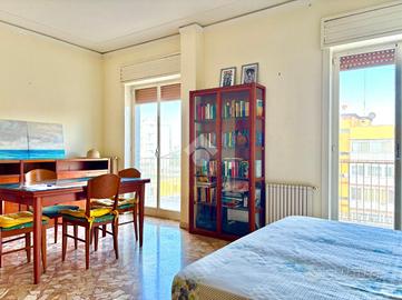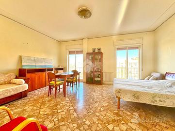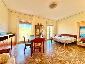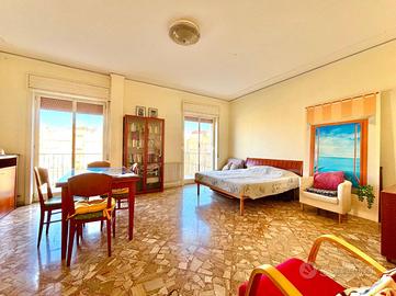 L'ingresso si apre su un comodo disimpegno che conduce sulla sinistra all'ampio salone doppio, dove originariamente erano presenti cucina e soggiorno: una soluzione che rende l'appartamento perfettamente predisposto alla realizzazione di un grande open space, con accesso diretto al balcone vista mare. Sempre sul lato sinistro troviamo il bagno e l'attuale cucina, ricavata da una ex camera da letto.