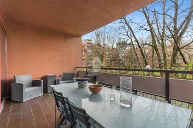 Proponiamo in vendita in residenza in fase di rifacimento facciate quadrilocale con hobby e box doppio di 181 mq. L'appartamento si compone di soggiorno con loggia fronte parco e sala da pranzo, cucina abitabile moderna con isola, quattro camere da letto matrimoniali di cui una con balcone, tre bagni di cui uno in camera, ripostiglio, cabina armadio e zona lavanderia. Collegato all'appartamento direttamente dal locale hobby un box doppio.