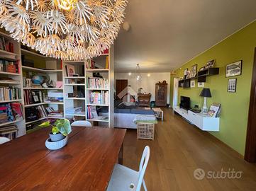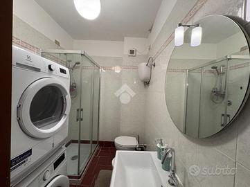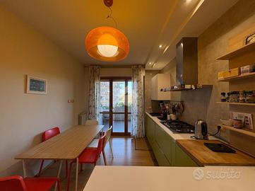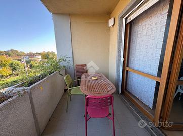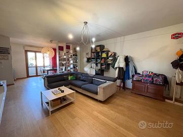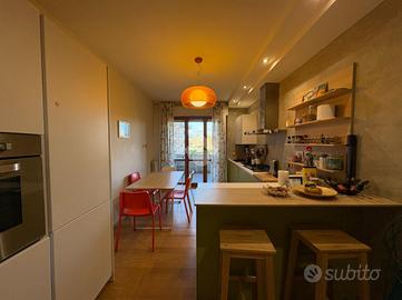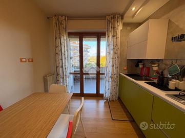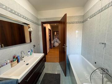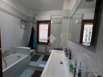 La cucina separata è spaziosa e dispone di un secondo terrazzo profondo, ideale per pranzi all'aperto. L'appartamento include due camere da letto matrimoniali e una camera singola, perfette per ospitare amici e familiari. I due bagni ben distribuiti garantiscono praticità e comfort per tutti gli occupanti. Inoltre, il garage al piano seminterrato di 18 mq è incluso nel prezzo, offrendo ulteriore comodità.