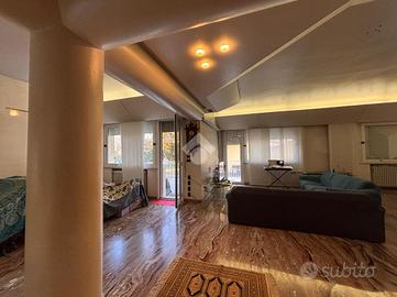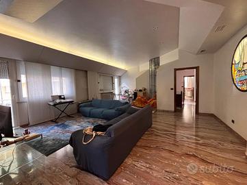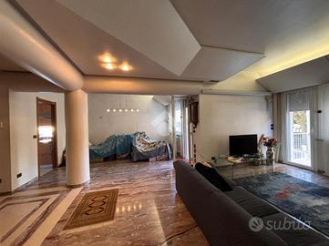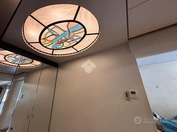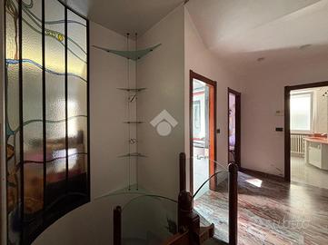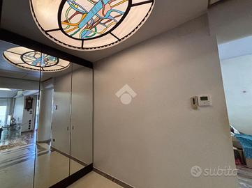 L ingresso si apre sul luminoso e ampio soggiorno, dove sono presenti anche delle vetrate artistiche che conferiscono personalità e raffinatezza all ambiente, un accesso al balcone e una cucina separata abitabile con vetrate panoramiche.