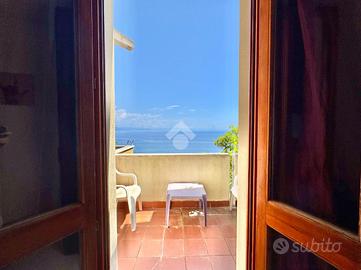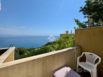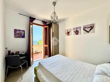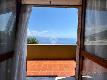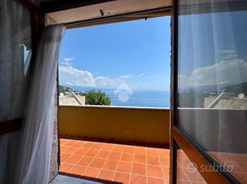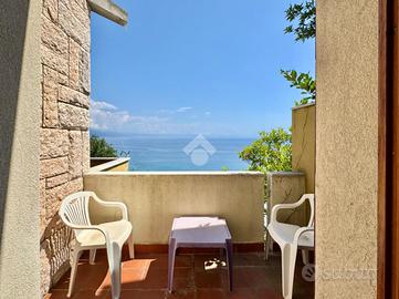Al termine della scalinata si apre un ampio terrazzo parzialmente perimetrale che circonda l'abitazione, uno spazio versatile e soleggiato dove organizzare pranzi e cene all'aperto, leggere un libro al sole o semplicemente godersi la splendida vista mare che si estende anche dall'interno della casa.