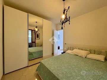 L'ingresso conduce a un soggiorno luminoso e accogliente, collegato al terrazzo panoramico, e a un tinello separato che può fungere da zona pranzo o essere trasformato in cucina abitabile. La zona notte è composta da una camera matrimoniale con balconcino privato affacciato sul mare, altre due camere matrimoniali spaziose e un bagno finestrato.