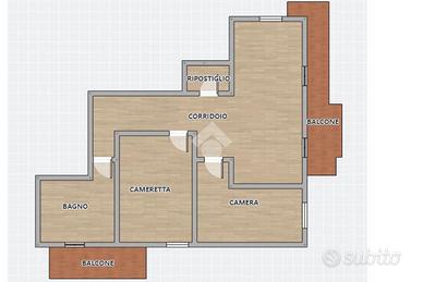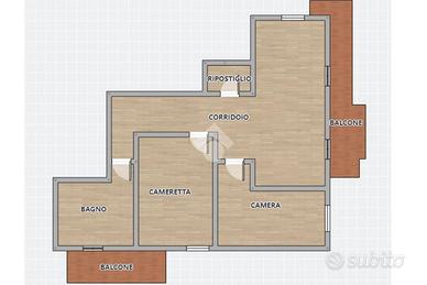 L'ingresso si apre su un corridoio che conduce ai vari ambienti della casa. Subito sulla destra troviamo un bagno con box doccia e balconcino, mentre proseguendo si accede alla cameretta e alla camera matrimoniale. Sul lato sinistro del corridoio è presente un pratico ripostiglio.