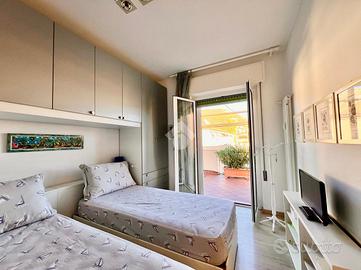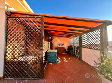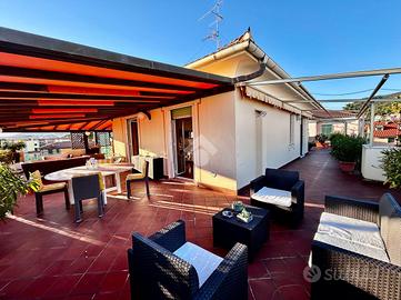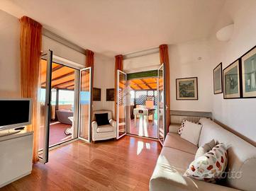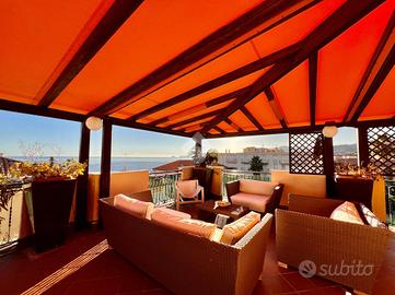 Punto di forza dell'immobile è il magnifico terrazzo che abbraccia l'intero appartamento, perfetto per pranzi e cene all'aperto, zone relax, solarium e momenti di convivialità. La presenza di una struttura in legno con tendaggio regolabile permette di modulare ombra e privacy, rendendo lo spazio esterno pienamente fruibile durante tutto l'an