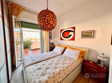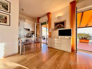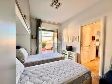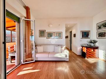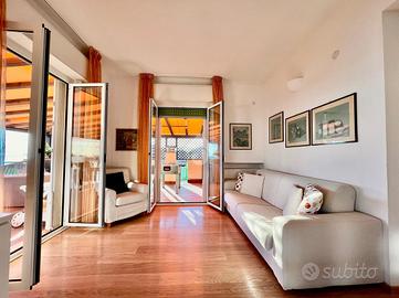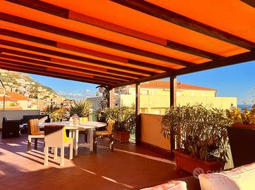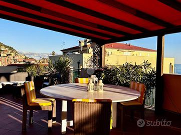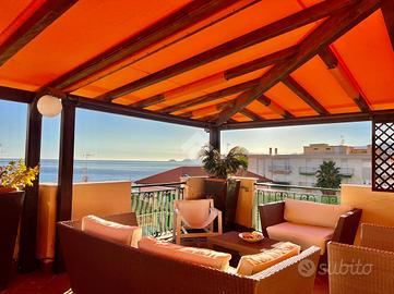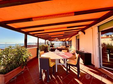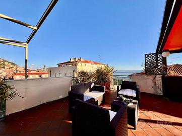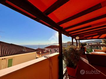 BORGIO VEREZZI - In posizione centrale e comoda ai servizi, a soli 50 metri dalle spiagge di Borgio Verezzi, elegante attico situato al quarto ed ultimo piano. La proprietà, completamente arredata e immediatamente abitabile, è caratterizzata da ambienti luminosi, ampi spazi interni e da un terrazzo perimetrale panoramico con vista mare e sulla collina di Verezzi.