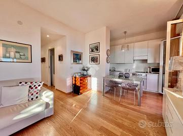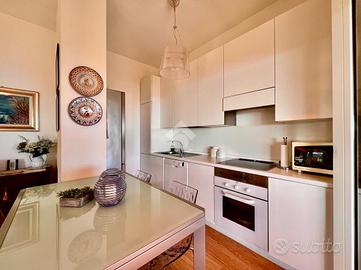 L'ingresso si apre su una ampia zona giorno dove soggiorno e cucina abitabile dialogano in modo naturale grazie ad una disposizione funzionale e accogliente. La parte dedicata al soggiorno è ampia, ideale per divani, area TV e angolo relax. Le grandi porte-finestre garantiscono luce naturale per tutta la giornata e consentono l'accesso diretto al terrazzo, creando un collegamento continuo tra interno ed esterno.