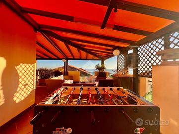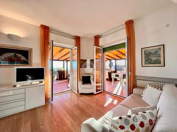 BORGIO VEREZZI - In posizione centrale e comoda ai servizi, a soli 50 metri dalle spiagge di Borgio Verezzi, elegante attico situato al quarto ed ultimo piano. La proprietà, completamente arredata e immediatamente abitabile, è caratterizzata da ambienti luminosi, ampi spazi interni e da un terrazzo perimetrale panoramico con vista mare e sulla collina di Verezzi. L'ingresso si apre su una ampia zona giorno dove soggiorno e cucina abitabile dialogano in modo naturale grazie ad una disposizione funzionale e accogliente. La parte dedicata al soggiorno è ampia, ideale per divani, area TV e angolo relax. Le grandi porte-finestre garantiscono luce naturale per tutta la giornata e consentono l'accesso diretto al terrazzo, creando un collegamento continuo tra interno ed esterno. La cucina abitabile, completa di arredi e pensata per essere pratica e conviviale, offre lo spazio necessario per pranzare comodamente in famiglia o cucinare con libertà, beneficiando anch'essa della luminosità e del collegamento diretto con la parte esterna dell'abitazione. Attraverso un corridoio di disimpegno si accede alla zona notte, composta da tre camere da letto spaziose e ben proporzionate. La disposizione interna consente a ciascun ambiente di essere utilizzato come camera matrimoniale, camera per ragazzi o stanza ospiti, offrendo un'elevata versatilità a seconda delle esigenze familiari o delle occasioni. La proprietà dispone di due bagni, di cui uno finestrato l'altro invece cieco ma con la possibilità di creare una finestra. Sul terrazzo è inoltre presente un locale lavanderia/ripostiglio, estremamente utile evitando ingombri negli interni. Punto di forza dell'immobile è il magnifico terrazzo che abbraccia l'intero appartamento, perfetto per pranzi e cene all'aperto, zone relax, solarium e momenti di convivialità. La presenza di una struttura in legno con tendaggio regolabile permette di modulare ombra e privacy, rendendo lo spazio esterno pienamente fruibile durante tutto l'