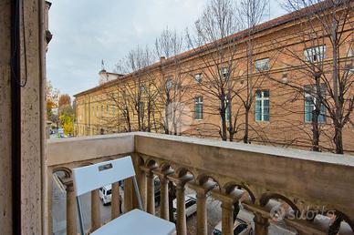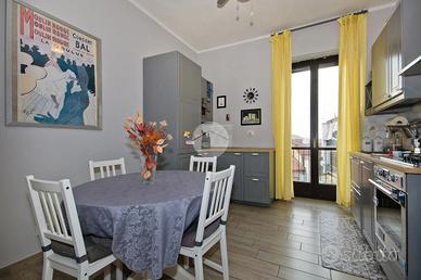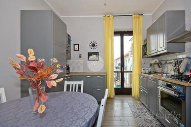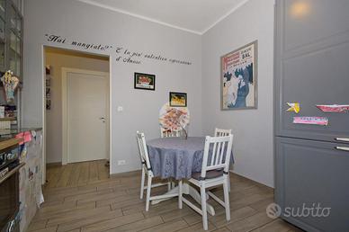 La zona giorno è composta da una cucina abitabile, con sfogo sul primo balcone ed affaccio sull'interno cortile, e da uno spazioso salotto con uscita sul secondo ed ultimo balcone della casa, con affaccio sulla via.