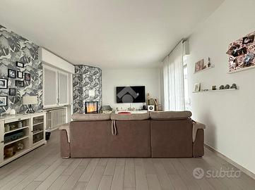 L'ingresso conduce ad un soggiorno di generosa metratura, impreziosito da camino termo-riscaldante a pellet e dalla presenza di due ampi balconi che conferiscono grande luminosità all'ambiente.
