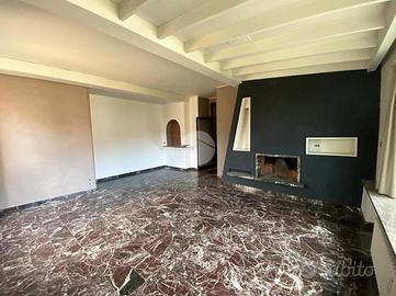 Percorrendo il corridoio si raggiunge la cucina abitabile con balcone, il soggiorno con pavimento in marmo e camino, il primo bagno finestrato con vasca.