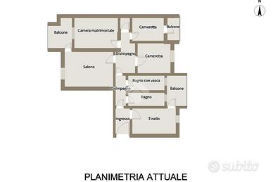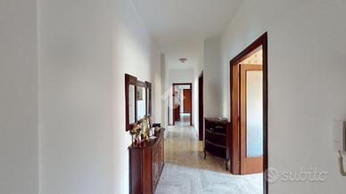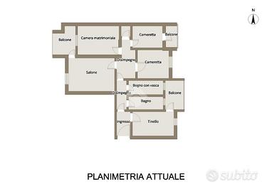 Dal disimpegno accediamo ai due bagni uno con vasca e uno con box doccia, alla camera matrimoniale anch'essa con il suo balcone di pertinenza, una cameretta con balcone e la terza cameretta.