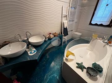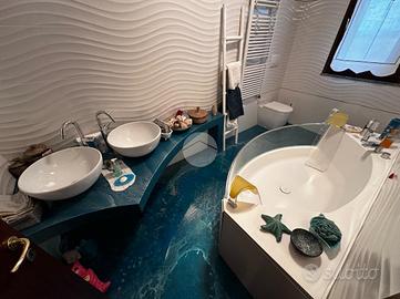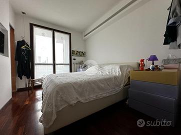 La zona notte comprende tre camere da letto, di cui una matrimoniale con cabina armadio e bagno privato finestrato con doccia, oltre a un ulteriore balcone. Completa l'abitazione un elegante bagno padronale con vasca idromassaggio, rifinito con materiali di pregio e pavimentazione in resina.
