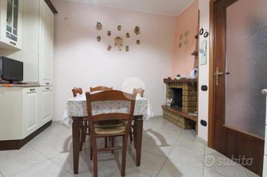 L'immobile è composto dalla sala molto luminosa che affaccia sul balcone, dalla cucina abitabile con camino, tre camere da letto e due bagni: uno finestrato e l'altro cieco.