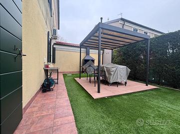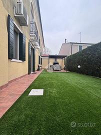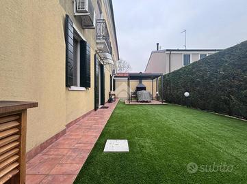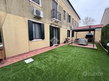 Camponogara: in località Prozzolo, nelle immediate vicinanze di tutti i servizi ma il strada secondaria molto tranquilla, appartamento al piano terra con ingresso indipendente. Dal giardino privato con esposizione a sud, si accede alla zona living dell'immobile composta da soggiorno e cucina openspace particolarmente luminosa vista la doppia esposizione. Attraverso un disimpegno si accese alla camera matrimoniale, a una seconda camera attualmente adibita a cabina armadio e a un primo bagno finestrato con doccia. Un secondo disimpegno presenta un ripostiglio ideale da adibire a lavanderia, una terza camera e un piccolo bagno di servizio finestrato. Dalla porta-finestra della zona giorno, è possibile uscire in un secondo giardino esclusivo con prato attualmente sintetico, completo di platea con gazebo, ideale per vivere lo spazio esterno in pieno comfort e privacy. Completano la proprietà un garage nel piano seminterrato e un posto auto all'interno dello spazio condominiale.