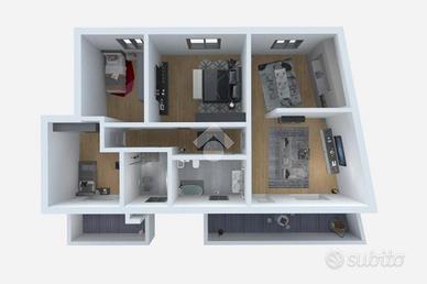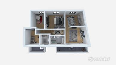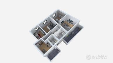 L'appartamento, situato al piano primo, è composto da una zona giorno con cucina abitabile, tre camere da letto e due servizi finestrati. Un terrazzino privato offre uno spazio esterno esclusivo, perfetto per momenti di relax.