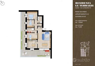 RESIDENZA LE TERRAZZE - 'Il lusso che meriti nello spazio che hai sempre immaginato' Cantù, precisamente nella frazione di Mirabello, prende forma un esclusivo intervento residenziale che darà vita a una palazzina elegante e signorile composta da 16 unità abitative. Il progetto architettonico è stato concepito per offrire ambienti generosi e armoniosi, le soluzioni al piano terra dispongono di portici e giardini privati, mentre gli appartamenti al primo piano al secondo e al terzo con attico sono valorizzati da grandi terrazzi panoramici, pensati per garantire privacy, comfort e una qualità abitativa superiore. Appartamento 12 - Piano secondo Ampio quadrilocale al piano secondo composto da cucina abitabile luminosa, grande soggiorno, doppi servizi, camera matrimoniale spaziosa e molto luminosa e cameretta. Il vero valore aggiunto dell'abitazione è il terrazzo privato di 71 mq, ideale per vivere momenti di relax all'aria aperta, garantendo al tempo stesso privacy e comfort. La residenza sorge in una posizione strategica e comoda a tutti i principali servizi, coniugando al meglio riservatezza e praticità quotidiana. Particolare attenzione è riservata alla qualità costruttiva e al dettaglio: finiture di pregio, materiali selezionati e soluzioni tecnologiche d'avanguardia definiscono un'abitazione di alto profilo. L'edificio sarà caratterizzato da alta efficienza energetica, completamente privo di gas, e dotato di impianti di ultima generazione con riscaldamento a soffitto, per un comfort discreto ed elegante in ogni stagione. A completamento dell'offerta, è prevista la disponibilità di pertinenze acquistabili separatamente, tra cui: Box singolo a € 21.000 Box doppio in lunghezza a € 42.000 Box doppio in larghezza a € 45.000 Posto auto scoperto esterno a € 8.000 Posto auto scoperto interno a € 10.000 Prezzi Cantina a Partire da € 5.000 CONSEGNA PREVISTA 2028 I render presentati sono puramente illustrativi e non corrispondono a un appartamento specifico.