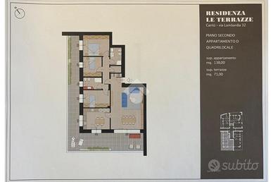 Ampio quadrilocale al piano secondo composto da cucina abitabile luminosa, grande soggiorno, doppi servizi, camera matrimoniale spaziosa e molto luminosa e cameretta.