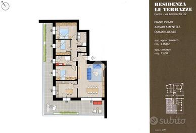 RESIDENZA LE TERRAZZE - 'Il lusso che meriti nello spazio che hai sempre immaginato' Cantù, precisamente nella frazione di Mirabello, prende forma un esclusivo intervento residenziale che darà vita a una palazzina elegante e signorile composta da 16 unità abitative. Il progetto architettonico è stato concepito per offrire ambienti generosi e armoniosi, le soluzioni al piano terra dispongono di portici e giardini privati, mentre gli appartamenti al primo piano al secondo e al terzo con attico sono valorizzati da grandi terrazzi panoramici, pensati per garantire privacy, comfort e una qualità abitativa superiore. Appartamento 08 - Piano Primo Ampio quadrilocale al piano primo composto da cucina abitabile luminosa, grande soggiorno, doppi servizi, camera matrimoniale spaziosa e molto luminosa e cameretta. Il vero valore aggiunto dell'abitazione è il terrazzo privato di 71 mq, ideale per vivere momenti di relax all'aria aperta, garantendo al tempo stesso privacy e comfort. La residenza sorge in una posizione strategica e comoda a tutti i principali servizi, coniugando al meglio riservatezza e praticità quotidiana. Particolare attenzione è riservata alla qualità costruttiva e al dettaglio: finiture di pregio, materiali selezionati e soluzioni tecnologiche d'avanguardia definiscono un'abitazione di alto profilo. L'edificio sarà caratterizzato da alta efficienza energetica, completamente privo di gas, e dotato di impianti di ultima generazione con riscaldamento a soffitto, per un comfort discreto ed elegante in ogni stagione. A completamento dell'offerta, è prevista la disponibilità di pertinenze acquistabili separatamente, tra cui: Box singolo a € 21.000 Box doppio in lunghezza a € 42.000 Box doppio in larghezza a € 45.000 Posto auto scoperto esterno a € 8.000 Posto auto scoperto interno a € 10.000 Prezzi Cantina a Partire da € 5.000 CONSEGNA PREVISTA 2028 I render presentati sono puramente illustrativi e non corrispondono a un appartamento specifico. Le