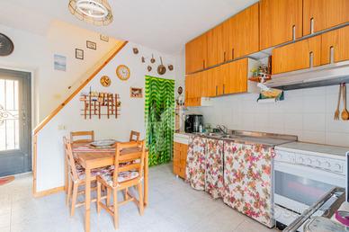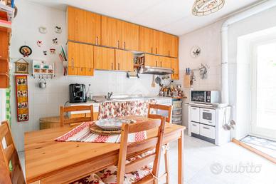 Tramite l'ingresso indipendente al piano terra, veniamo introdotti nei locali di casa: ci accoglie la spaziosa cucina abitabile con dispensa ed uscita sul terrazzo, che consente di godere di uno spazio aperto con vista sul verde. Adiacente alla cucina troviamo il bagno con doccia. Lungo il piano terra si dispongono inoltre una camera adibita a studio ed un doppio salone con camino.