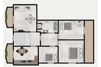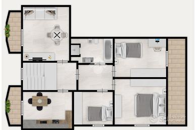 L'abitazione si sviluppa principalmente al primo piano, dove un ampio disimpegno conduce ai diversi ambienti: un soggiorno luminoso con balcone, una cucina abitabile anch'essa con balcone, tre camere da letto ed un bagno. Il piano terra comprende un locale lavanderia e una cantina, perfetti per organizzare gli ambienti secondo le proprie esigenze.