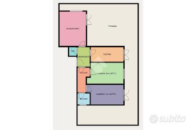 La disposizione è funzionale con una netta divisione tra la zona notte e quella giorno. L'ingresso fa da disimpegno tra il salotto doppio e la cucina abitabile, mentre alla zona notte ci si accede tramite il corridoio. Le due stanze da letto sono entrambe matrimoniali e godono come tutte le altre stanze dell'uscita sulla terrazza.