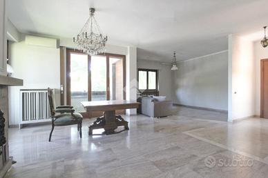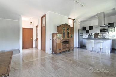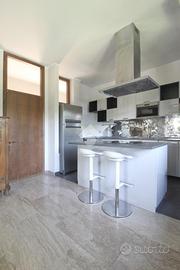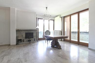 L'ingresso dal curato e grande atrio condominiale, passando per la porta blindata, invita nell'immensa zona giorno della casa, con i suoi pavimenti in pregiato marmo in piena sinergia estetica con il camino che domina il soggiorno. L'area living si configura come un ambiente openspace dove spicca la cucina in stile americano con isola centrale ed è pienamente illuminato dalle ampie portefinestre.