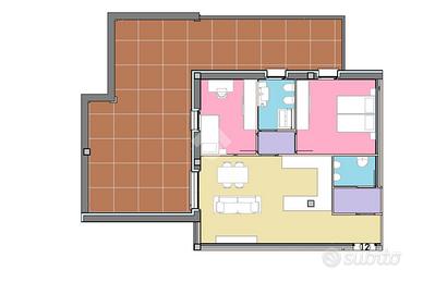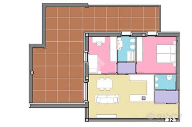 Il luminoso soggiorno si apre su un grande terrazzo di circa 60 mq , ideale per momenti di relax all'aperto.
