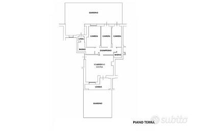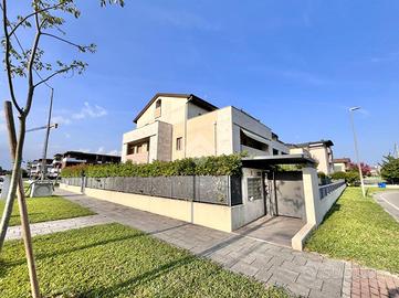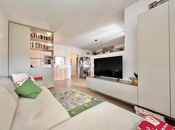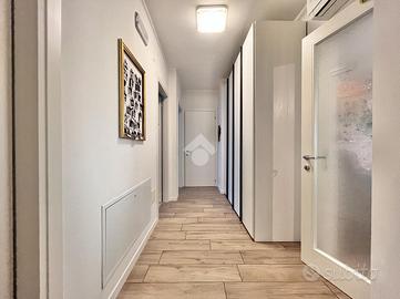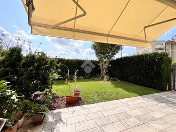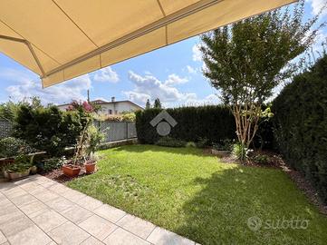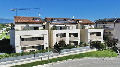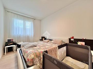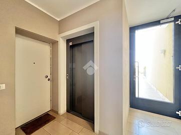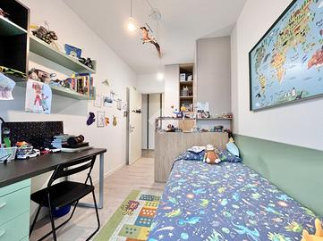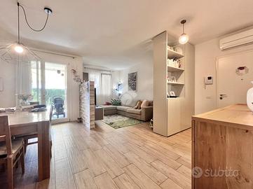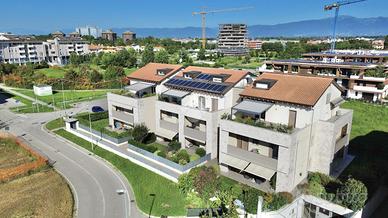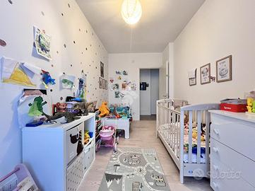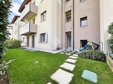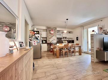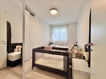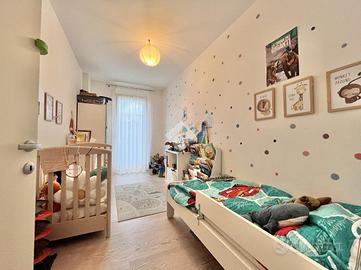 L'immobile si inserisce in una palazzina del 2013 ed è disposto su un unico livello: soggiorno-cucina in openspace con porta finestra che dà alla loggia esterna e al giardino privato esposto a sud; dal disimpegno si ha accesso alla zona notte, dove si collocano le tre spaziose camere da letto, di cui una matrimoniale e due camere doppie con accesso al secondo giardino privato esposto a nord e i due bagni.