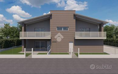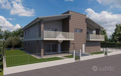 L'unità è completata da un garage doppio in larghezza, comunicante con l'interno dell'abitazione, da un portico privato e coperto e da un ampio giardino privato che ricopre 3 lati dell'immobile.
