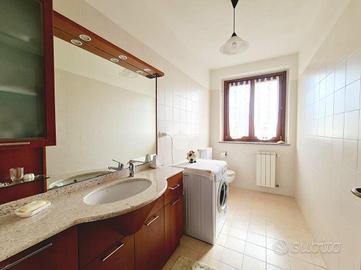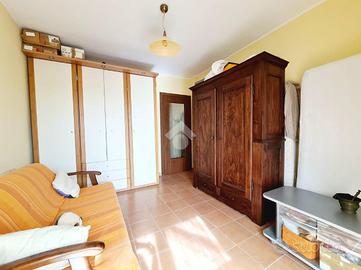 L'appartamento rimane al piano terra e ha lo sfogo privato sia dalla cucina abitabile sia dal soggiorno, con la vista panoramica sulle colline di Castiglione Torinese. La soluzione ha un'esposizione su tre aree, ha due camere da letto matrimoniali e i doppi servizi entrambi con la finestra.