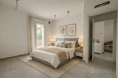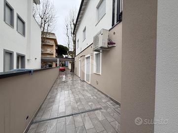 PINARELLA - LUNGOMARE : A Pinarella, a soli 50 metri dalla sabbia e dal profumo del mare, proponiamo una soluzione abitativa davvero unica: un appartamento al piano terra, libero su tre lati, inserito in una piccola residenza di sole tre unità, appena ultimata. Questa proprietà si distingue per la sua posizione privilegiata: centrale e comodissima ai servizi, ma al tempo stesso appartata, grazie a un ingresso riservato che garantisce privacy e tranquillità in ogni momento dell'anno. L'accesso avviene tramite un elegante vialetto pedonale che conduce all'ampio soggiorno con cucina in nicchia. Da qui, grandi aperture vetrate accompagnano verso il giardino privato di circa 50 mq, progettato come un vero prolungamento della casa: zona pranzo ombreggiata davanti al living e area relax sul lato notte, con predisposizione per idromassaggio. L'esposizione a Nord del fronte principale regala un comfort climatico perfetto nelle giornate estive, rendendo gli spazi esterni vivibili dall'ora di pranzo fino alla sera. Il piano terra ospita inoltre due camere da letto, una delle quali con bagno privato, oltre a un secondo bagno. Ogni ambiente gode dell'affaccio diretto sul giardino, creando una continuità visiva e funzionale rara da trovare. Una raffinata scala in legno conduce al livello superiore, dove una stanza di circa 12 mq (h 2,65 m costanti) offre la possibilità di creare una terza camera, uno studio o uno spazio hobby, con accesso a un terrazzo riservato. Completano la proprietà un posto auto coperto e una dotazione impiantistica di ultima generazione: termocappotto, infissi in PVC, riscaldamento a pavimento con pompa di calore Mitsubishi, aria condizionata. Una casa moderna, efficiente e pronta da vivere. Questa è la soluzione ideale per chi desidera un'abitazione contemporanea con ampi spazi outdoor, a due passi dalla spiaggia e dal cuore di Pinarella, perfetta sia come residenza estiva sia per viverci tutto l'anno. Acquisto da impresa con IVA agevolata: 4% c