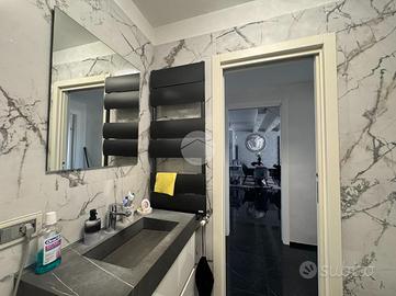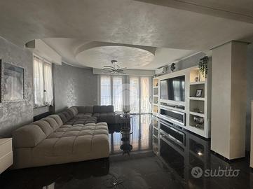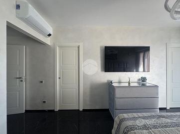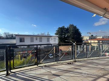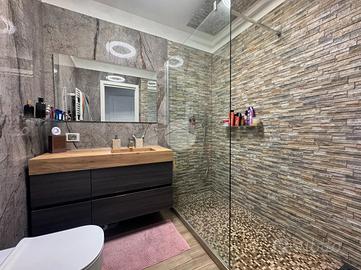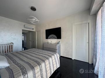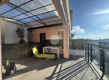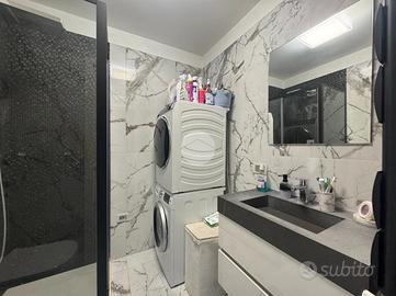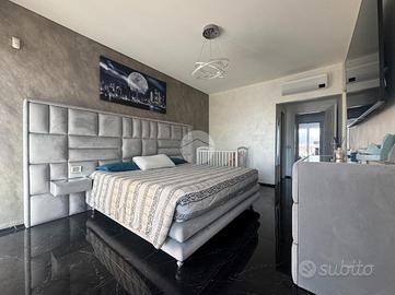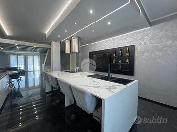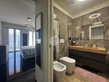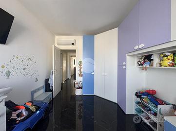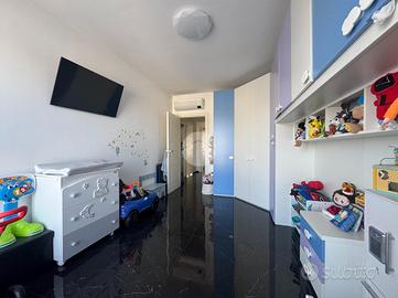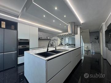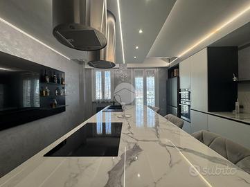 Nel quartiere di Sacra Famiglia, proponiamo in vendita esclusivo appartamento su due livelli, con ascensore, al secondo e terzo ed ultimo piano con terrazzo, cantina e box. Entrando dalla porta d'ingresso ci troviamo in un living di grande impatto scenografico, dove lo sguardo viene catturato dalla profondità degli spazi e dalla luminosità, che attraversa ogni angolo grazie alla doppia esposizione est-ovest. Il cuore dell'abitazione è proprio la zona giorno, un ambiente unico suddiviso in tre aree ben distinte: l'angolo tv, valorizzato da un divano di design, con accesso al terrazzo coperto; la zona pranzo, con tavolo in vetro; l'importante cucina a vista, che si integra perfettamente attraverso un elemento lineare essenziale e un'isola centrale che diventa tavolo, piano di lavoro e luogo di convivialità, con accesso ad un ulteriore balconcino. Il disimpegno separa la zona notte, dove troviamo: la camera padronale con letto king size, bagno en suite con doccia walk in, cabina armadio e balconcino privato loggiato; dall'altro lato la cameretta, spaziosa e dotata di balconcino; infine un secondo bagno, moderno e funzionale, con doccia e angolo lavanderia, a servizio della cameretta e della zona giorno. A movimentare il volume del soggiorno, un'elegante scala, rifinita in marmo, conduce al terzo piano, dove troviamo un ampio locale open space, reso luminoso dai velux, un ambiente dinamico e capace di adattarsi alle diverse esigenze. A completare questo piano, un terzo bagno con vasca doccia idromassaggio e una comoda cabina armadio. La proprietà include, al piano interrato, l'ampio box con basculante elettrica e la cantina, di generosi dimensioni. L'immobile è stato oggetto di recente ristrutturazione con finiture di pregio. L'atmosfera è minimalista ma accogliente, grazie all'uso di elementi architettonici, ribassamenti, luci led e alla continuità delle superfici, che regalano un senso di ordine assoluto e lusso contemporaneo. Riscaldamento autonomo. Dotato di ari
