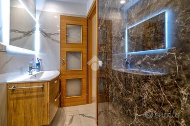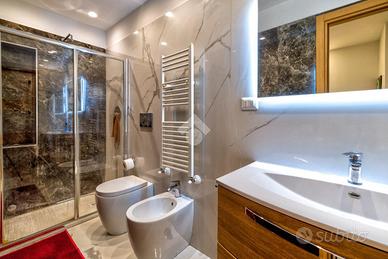 La zona notte si compone di tre camere da letto e due bagni: uno, finestrato, con vasca e pratica zona lavanderia, e l'altro ensuite, cieco, nella camera matrimoniale, completo di box doccia.