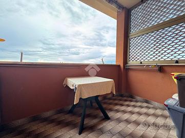 L'ingresso si apre su un corridoio che, sulla destra, conduce all'ampio soggiorno, un ambiente comodo e ben distribuito. Proseguendo, sempre sulla destra, troviamo la cucina abitabile, separata e funzionale, dotata di ripostiglio e accesso al terrazzo con affaccio aperto e vista mare.