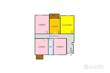 L'ingresso di casa è su un comodo disimpegno che ci invita in un soggiorno e con delle superfici regolari e ben sfruttabili, avendo pareti lineari dove poter adattare qualsiasi tipologia di arredamento.