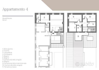 Nello specifico parliamo di un quadrilocale duplex posto al primo ed ultimo piano, composto da: zona giorno: un ingresso, una cucina abitabile, un soggiorno, una lavanderia, un bagno finestrato. Successivamente una scala interna porta nella zona notte, composta da: una camera matrimoniale, due camere singole, due bagni, un terrazzo a tasca di oltre 20 metri quadri, con possibile ampliamento.