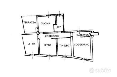 Ingresso, soggiorno, cucina abitabile, due camere da letto matrimoniali, studio e bagno finestrato con doccia.