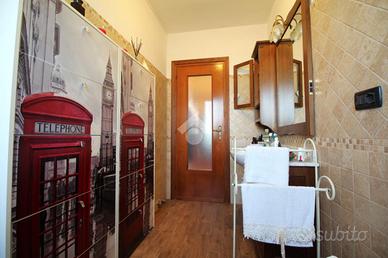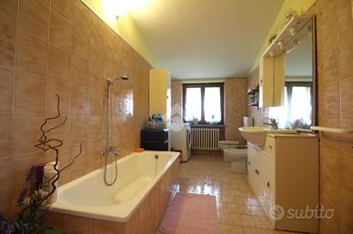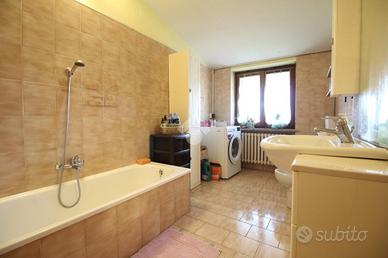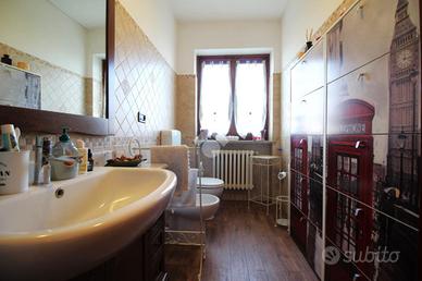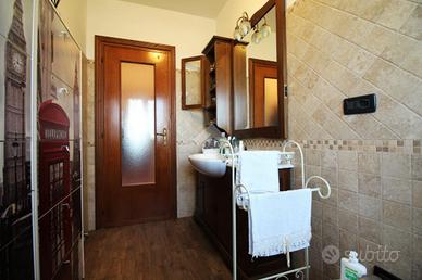 Il bagno al piano terra, ristrutturato nel 2015, è di servizio e presenta sanitari e lavandino ed è piastrellato in gres porcellanato dall'effetto legno, conferendo un tocco contemporaneo.