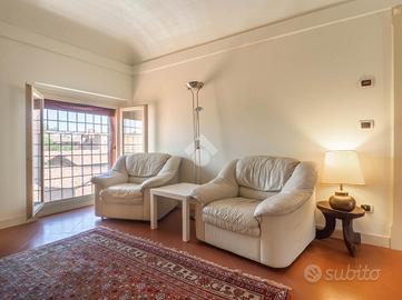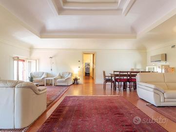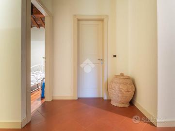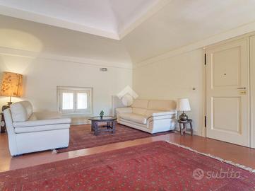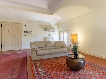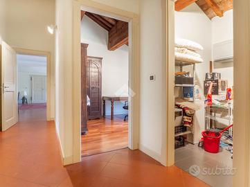 Via Garibaldi, Palazzo Bentivoglio. All'interno di un palazzo d'epoca vincolato dalle Belle Arti proponiamo in esclusiva un prestigioso appartamento al piano nobile, con doppio affaccio sul giardino interno condominiale e sulla retrostante Piazzetta Cacciaguida. Si accede all'immobile da un piccolo pianerottolo comune soltanto ad un altro appartamento, al quarto e ultimo piano del palazzo servito da ascensore. Questa elegante soluzione abitativa si compone di ingresso sul doppio salone, molto luminoso grazie alle numerose finestre e alla doppia esposizione, diviso in zona pranzo e comoda zona conversazione. Un corridoio distribuisce lo spazio della zona giorno fra la cucina abitabile, il primo servizio cieco completo di doccia ed un comodo ripostiglio. La zona notte si compone di un utile salottino/studio e di tre camere da letto, di cui la principale è corredata di una cabina armadio e di un bagno en suite finestrato. L'appartamento si presenta nello stato restaurato del 2003, anno dell'intervento più significativo che ha coinvolto l'intero edificio. Sulla base delle linee guida della Soprintendenza, le 32 unità immobiliari sono state rifinite internamente con pavimenti in cotto e in legno, davanzali e soglie in marmo bianco, serramenti esterni in legno con vetrocamera, tende oscuranti esterne del tipo alla "ferrarese", porte interne in legno massiccio, soffitti con travi a vista nella zona notte. L'appartamento si configura come una soluzione unica nel suo genere per posizione centrale, contesto signorile ottimamente curato nelle parti comuni e superficie interna adatta a chi desidera le comodità, gli ampi spazi interni e la cura dei dettagli. A disposizione, a parte, un comodo box privato in una rimessa condominiale alla quale si accede dalla Piazzetta Cacciaguida.