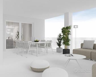 Living Open Space: L'ampio living 'open space' accoglie gli ospiti in un ambiente luminoso e arioso. La cucina a vista si integra perfettamente nel contesto, creando uno spazio ideale per la convivialità e il relax, offrendo diretto accesso all'ampio terrazzo.