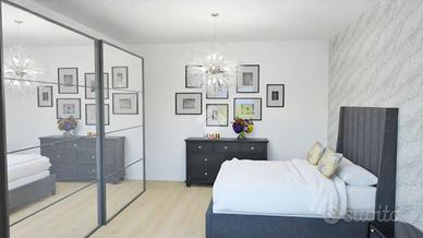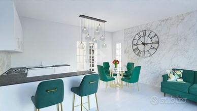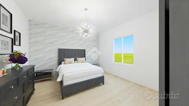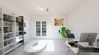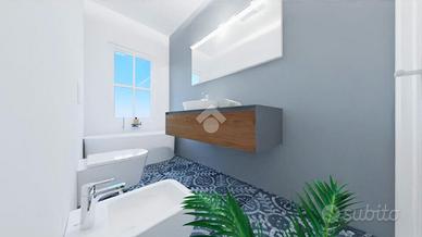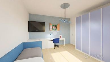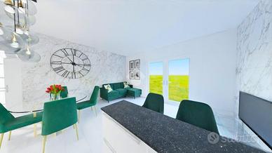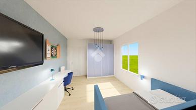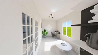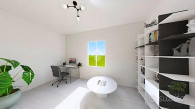 Soggiorno/cucina open space, due camere matrimoniali, doppi servizi finestrati e studio. Dal soggiorno si accede al giardino esclusivo con buona esposizione. Possibilità di scegliere la metratura del giardino.