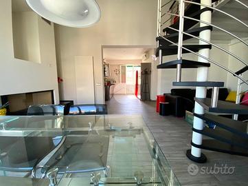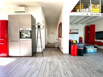 L'immobile si apre su un disimpegno che conduce nell'ampia e luminosa zona giorno open-space composta da cucina con balcone abitabile, soggiorno con balcone e soppalco, completa la zona giorno un ripostiglio adibito a zona lavanderia.