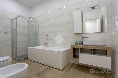 Procedendo, troviamo l'angolo cottura con finestra che da sulla corte, anche questo con con piano effetto marmo e piastre a induzione, ed infine un ampio e lussuoso bagno finestrato, caratterizzato da pensili e sanitari sospesi, box doccia a vetro e vasca da bagno.