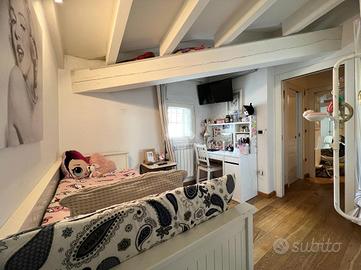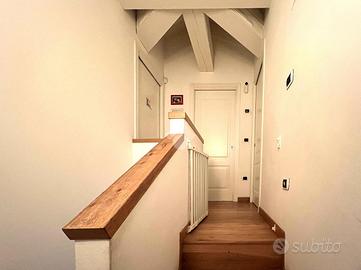Il piano superiore, collegato da elegante scala rivestita in legno, ospita due vani ad uso camera ed un secondo servizio igienico finestrato.