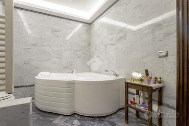 Continuando sulla destra, troviamo la camera matrimoniale finestrata con accesso al secondo bagno, anch'esso finestrato, con pavimenti e pareti effetto marmo e vasca da bagno.
