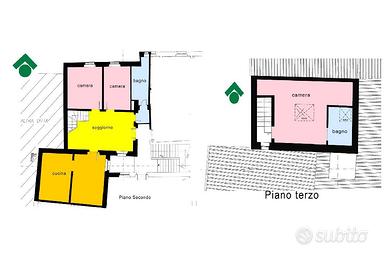 Piano secondo: ingresso su luminoso soggiorno, cucina abitabile, due camere matrimoniali e bagno.