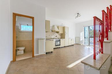 Il primo piano ospita un soggiorno luminoso con zona cucina, un terrazzo abitabile e un comodo bagno di servizio .
