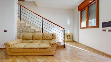 Disposta su due livelli, oltre a lavanderia e terrazzo, ci accoglie al piano terra, una calda e ampia zona living dove è stato realizzato un moderno abbassamento di tetto per i faretti.