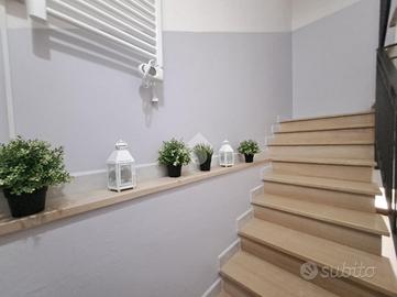 Entrando dall'ingresso privato troviamo le scale che portano al piano superiore dove si sviluppa l'intero appartamento.