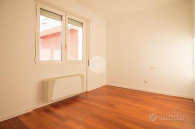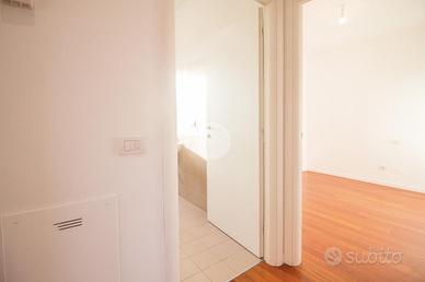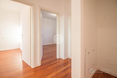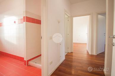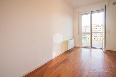 La zona giorno è composta da soggiorno e cucina separata, entrambi con balcone e doppia esposizione est-ovest, che garantisce luce naturale per tutto il giorno. La pavimentazione in parquet moderno valorizza ogni ambiente, ad eccezione dei due bagni finestrati. Nella zona notte troviamo tre camere da letto e un pratico ripostiglio.
